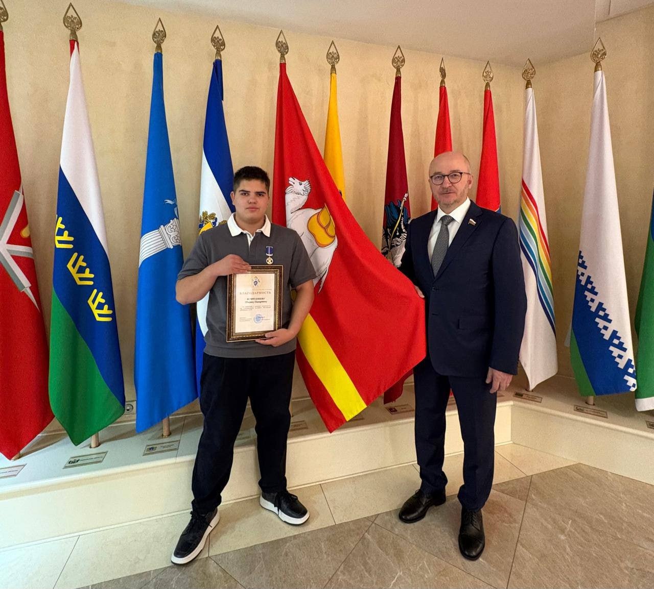 Среди награжденных – челябинец Тигран Исингалеев. В апреле 2025 года в челябинском поселке Новосинеглазово случилось ЧП: в школу № 145 ворвался мужчина в состоянии опьянения. Он выломал турникет, устроил погром в кабинете директора, угрожал ученикам. В школе началась паника, напуганные дети разбегались кто куда и прятались. В этой опасной ситуации не растерялся девятиклассник Тигран Исингалеев. Он встал на пути преступника, применил силовой прием и удерживал его, пока не подоспела помощь.